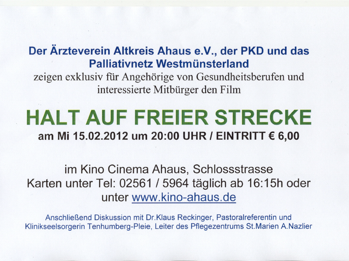 Nachdem bereits die Ausstellung "Wegbegleiter im Sterben" ein großer Erfolg war, waren die Veranstalter von der Resonanz des Publikums überwältigt: es kamen 300 Zuschauer und füllten 1,5 Kinosäle. Etwa 66% der Zuschauer folgten anschließend der Diskussion eines Podiums mit Dr.Klaus Reckinger, Palliativmediziner aus Herten, Frau Tenhumberg-Pleie, Klinikseelsorgerin, Herrn Ali Nazlier, Leiter des Pflegezentrums St.Marien, Ahaus, und Dr.Dr.Balbach als Leiter der Veranstaltung und dem Publikum.