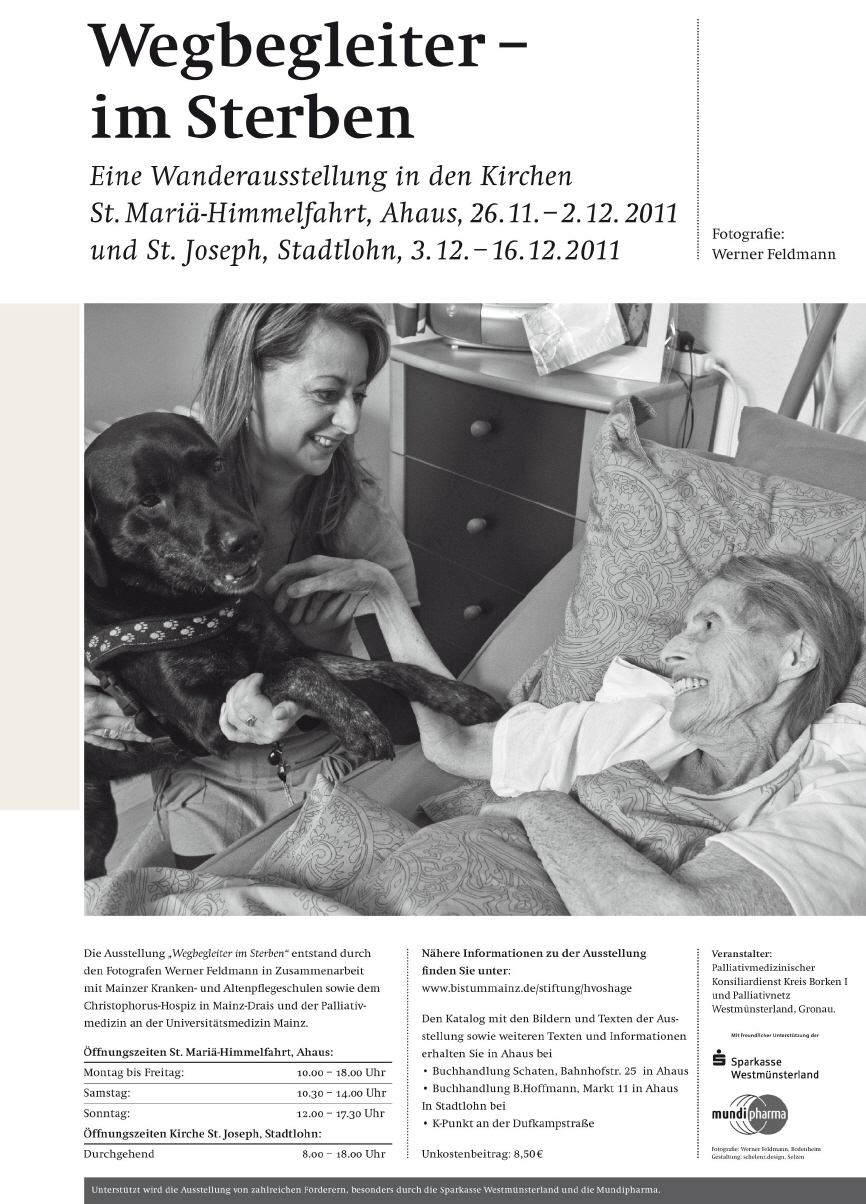 Die Ausstellung präsentierte 22 Schwarz-Weiß-Fotografien des Fotografen Werner Feldmann mit Texten, die in Zusammenarbeit mit Schülerinnen und Schülern von Mainzer Kranken- und Altenpflegeschulen sowie Mitarbeitern des Christophorus-Hospizes in Mainz-Drais und der Palliativmedizin an der Universitätsklinik Mainz entstanden sind. Die Ausstellung stellte das Netz der Wegbegleiter vor, nahm den Betrachter mit auf den Weg des Sterbens und zeigte intime, aber nicht entblößende Einblicke in die Welt und die Einsamkeit der trauernden Angehörigen.
